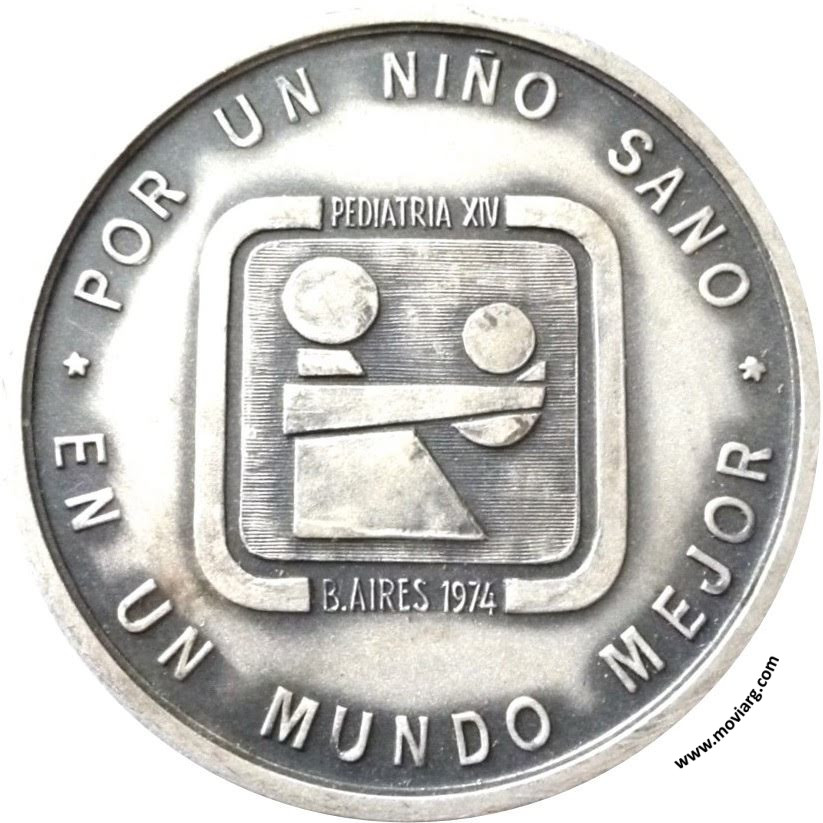 Anverso: POR UN NIÑO SANO / EN UN MUNDO MEJOR / PEDIATRIA XIV / B. AIRES 1974 Reverso: HOMENAJE DEL / XIV / CONGRESO INTERNACIONAL / DE PEDIATRIA / Y DE LA / SOCIEDAD ARGENTINA / DE PEDIATRIA / BS. AS. 3 · 9 · OCTUBRE · 1974 Referencia: | |