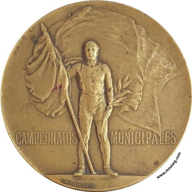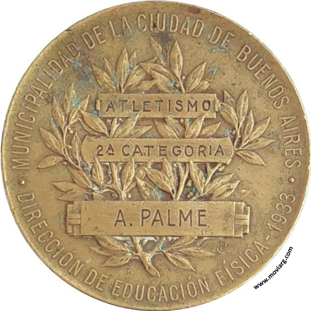 Anverso: CAMPEONATOS / MUNICIPALES. Firma: CONSTANTE ROSSI Reverso: MUNICIPALIDAD DE LA CIUDAD DE BUENOS AIRES / DIRECCIÓN DE EDUCACIÓN FÍSICA - 1933 / [ ATLETISMO ] / [ 2A. CATEGORIA ] / [ A. PALME ] Referencia: | |