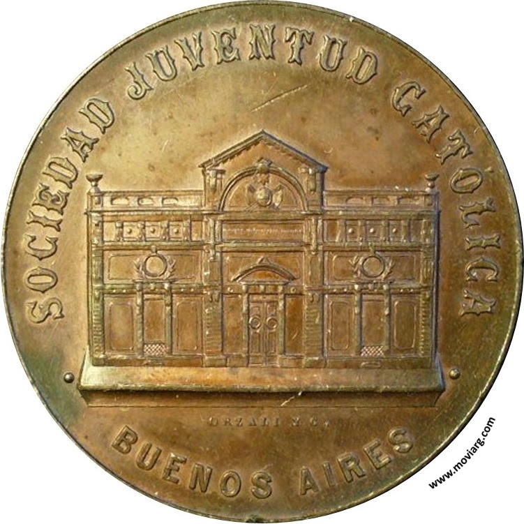 Anverso: SOCIEDAD JUVENTUD CATÓLICA / BUENOS AIRES. Firma: ORZALI Y C. Reverso: COLOCACION DE LA PIEDRA FUNDAMENTAL DEL EDIFICIO SOCIAL / 22 NOVIEMBRE 1896 / BENDECIDA / POR EL / ILMO. Y RMO. / DR. ULADISLAO CASTELLANO / PADRINOS / STA. MAURICIA PEREYRA / PBO. DR. ANGEL BRASESCO Referencia: | |