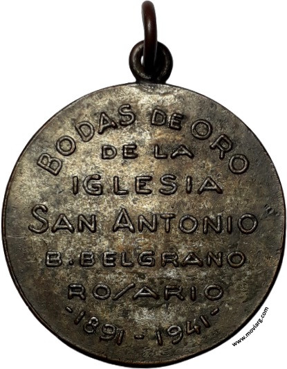 Colección MDS Anverso: PARROQUIA DE S. ANTONIO. Firma: GIROLA GALLOReverso: BODAS DE ORO / DE LA / IGLESIA / SAN ANTONIO / B. BELGRANO / ROSARIO / 1891 - 1941 Referencia: | |