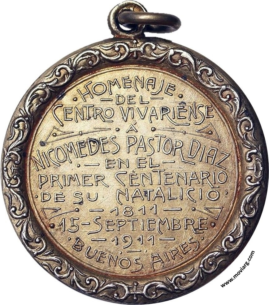 Anverso: NICOMEDES PASTOR DIAZ. Firma: F. COSTA Reverso: HOMENAJE / DEL / CENTRO VIVARIENSE / A / NICOMEDES PASTOR DIAZ / EN EL / PRIMER CENTENARIO / DE SU NATALICIO / 1811 / 15 - SEPTIEMBRE / 1911 / BUENOS AIRES Referencia: | |