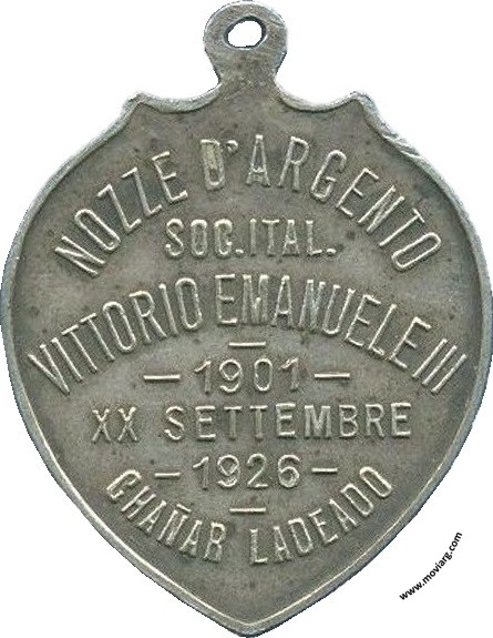 Anverso: Firma: CONSTANTE ROSSI Reverso: NOZZE D'ARGENTO / SOC. ITAL. / VITTORIO EMANUELE III / 1901 / XX SETTEMBRE / 1926 / CHAÑAR LADEADO Referencia: | |