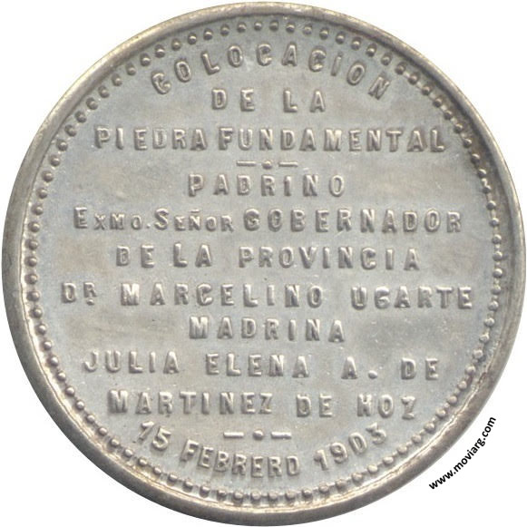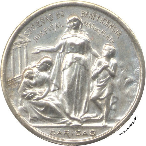 Anverso: SOCIEDAD DE / BENEFICENCIA / HOSPITAL / MAR DEL PLATA / CARIDAD Reverso: COLOCACION / DE LA / PIEDRA FUNDAMENTAL / PADRINO / EXMO. SEÑOR GOBERNADOR / DE LA PROVINCIA / DR. MARCELINO UGARTE / MADRINA / JULIA ELENA A. DE / MARTINEZ DE HOZ / 15 FEBRERO 1903 Referencia: | |