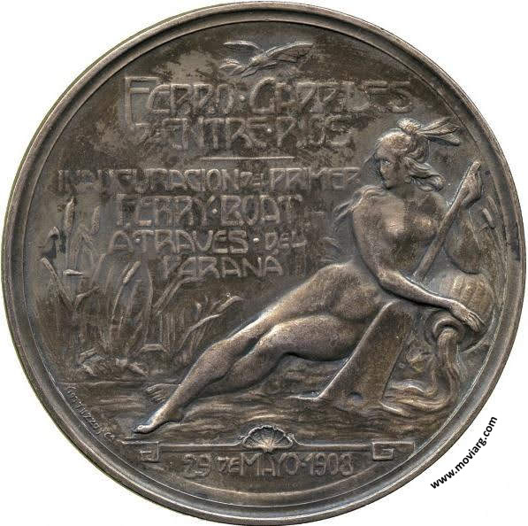 Anverso: Reverso: FERRO CARRILES / DE ENTRE RIOS / INAUGURACION DEL PRIMER / FERRY BOAT / Á TRAVES DEL / PARANÁ / 29 DE MAYO 1908. Firma:GOTTUZZO Y CA. Referencia: | |