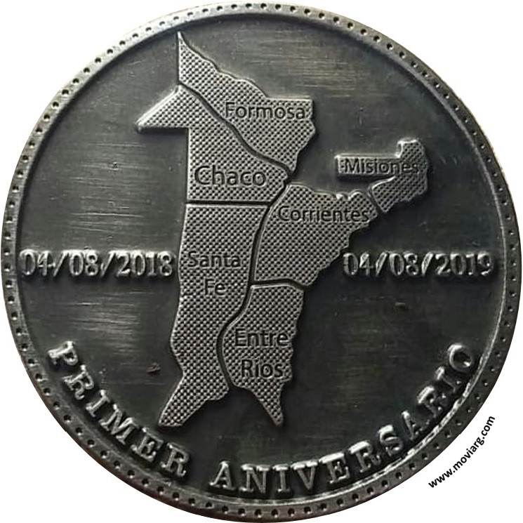 Anverso: NUMISMÁTICOS DEL LITORAL Reverso: 04/08/2018 / PRIMER ANIVERSARIO / 04/08/2019. Campo: FORMOSA / CHACO / MISIONES / CORRIENTES / SANTA FE / ENTRE RIOS Referencia: | |