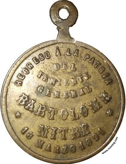 Anverso: HONOR AL ILUSTRE ARGENTINO Reverso: REGRESO Á LA PATRIA / DEL / TENIENTE / GENERAL / BARTOLOME / MITRE / 18 MARZO 1891 Canto: Humberto Burzio: "Buenos Aires en la medalla" 1981 p32. Referencia: BURZIO-52 | |