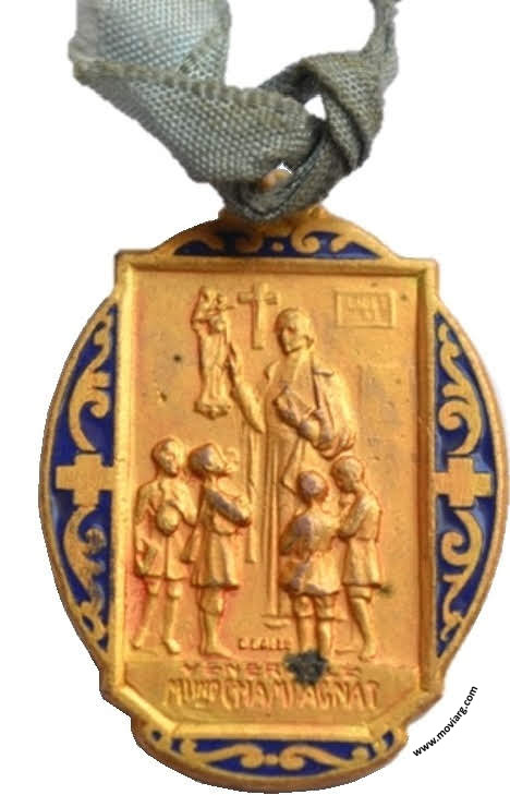 Anverso: VENERABLE / MLINO. CHAMPAGNAT. Firma: O. GALLO. Campo: DIOS / ME VE Reverso: COLEGIO NTRA. / SRA. DEL ROSARIO / H. H. MARISTAS / PREMIO / [ 1R. ] CAT. / [ 1949 ] Referencia: | |