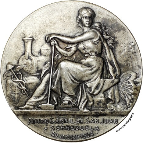 Anverso: FERRO CARRIL DE SAN JUAN / A SERREZUELA / 20 MARZO 1904 Reverso: REPUBLICA ARGENTINA / MINISTERIO DE O. PÚBLICAS / PRESIDENTE / JULIO A. ROCA / MINISTRO / EMILIO CIVIT. Firma: J. GOTTUZZO Referencia: | |