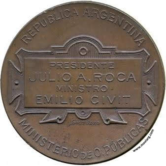| Año: 1904 Ferrocarriles Metal: Cobre - Peso: 26gr - Módulo: 41mm - Rotación: 12hrs Grabador: Juan Gottuzzo | |