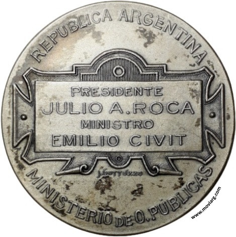 | Año: 1904 Ferrocarriles Metal: Plateado - Peso: 33.9gr - Módulo: 40.5mm - Espesor: 2.86mm - Rotación: 12hrs Grabador: Juan Gottuzzo | |