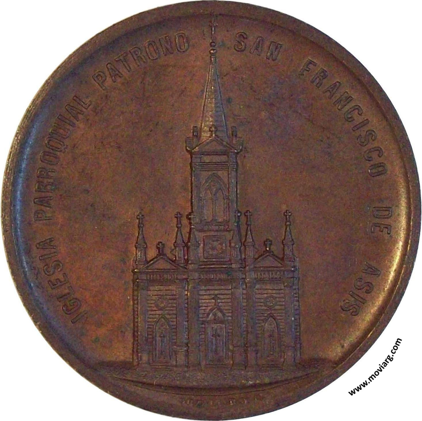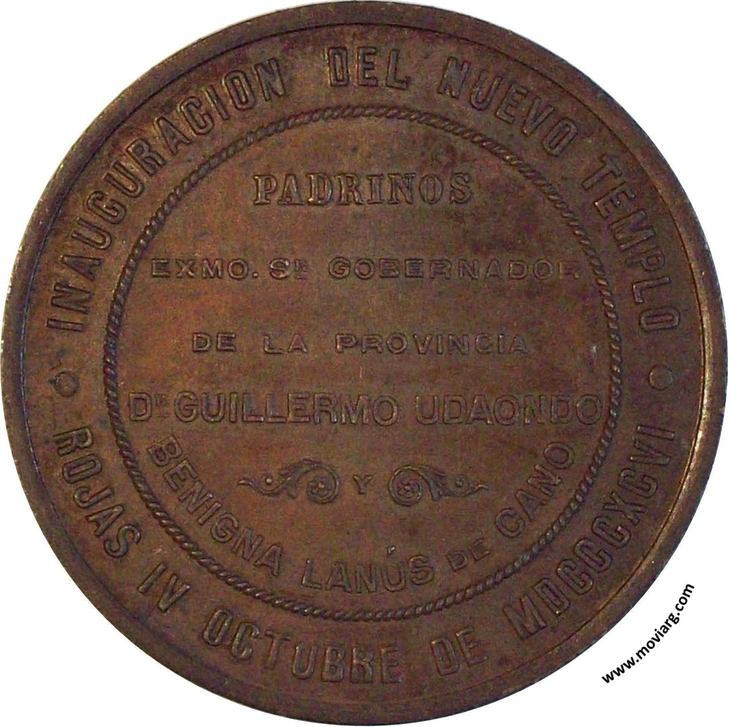 Anverso: IGLESIA PARROQUIAL PATRONO SAN FRANCISCO DE ASIS. Firma: ORZALI B. Y C. Reverso: INAUGURACION DEL NUEVO TEMPLO / PADRINOS / EXMO. SR. GOBERNADOR / DE LA PROVINCIA / DR. GUILLERMO UDAONDO / BENIGMA LANÚS DE CANO / ROJAS IV OCTUBRE DE MDCCCXCVI Referencia: | |