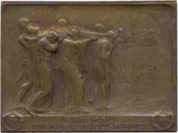 Anverso: MANUEL / BELGRANO / 1770 / 1820. Firma: GOTTUZZO Y PIANA Reverso: EL COLEGIO NACIONAL / DE / BUENOS AIRES / AL GLORIOSO ALUMNO / DEL COLEGIO SAN CARLOS / DN. MANUEL BELGRANO / 1820 - 20 JUNIO - 1920
