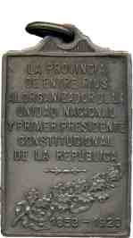 Anverso: CAPITAN GENERAL / JUSTO JOSÉ DE URQUIZA. Firma: CONSTANTE ROSSI Reverso: LA COMISIÓN / DEL HOMENAJE NACIONAL / AL LIBERTADOR, FUNDADOR / DE LA / UNIDAD ARGENTINA / Y PRIMER PRESIDENTE / CONSTITUCIONAL / B. AIRES / 11 NOVIEMBRE 1920