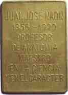 Anverso: NAON. Firma: J. FIORAVANTI Reverso: JUAN JOSÉ NAON / 1856 - 1920 / PROFESOR / DE ANATOMÍA / MAESTRO / EN LA CIENCIA / Y EN EL CARACTER